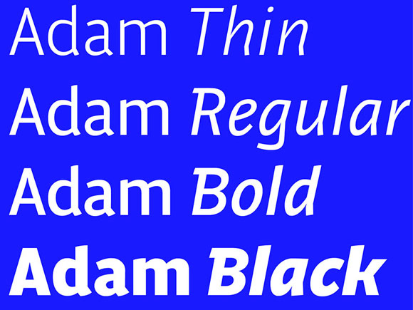 Adam es otro diseño de Koovit influenciado por los tipos sin remates humanistas y grotescos. Adam ofrece doce estilos, siendo cuatro de ellos «estarcidos».
