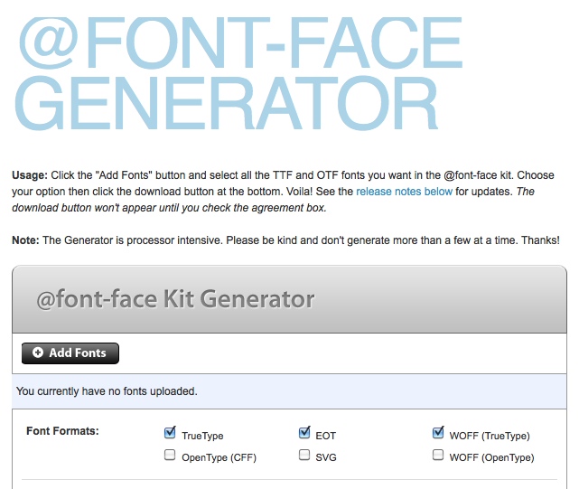 Para la creación de este tipo de fuentes, existe una aplicación on line en el web de Fontsquirrel, que permite subir fuentes en formato TTF y OT y convertirlas a los mencionados formatos y a la vez, generar los archivos CSS necesarios para su correcta visualización en los navegadores.