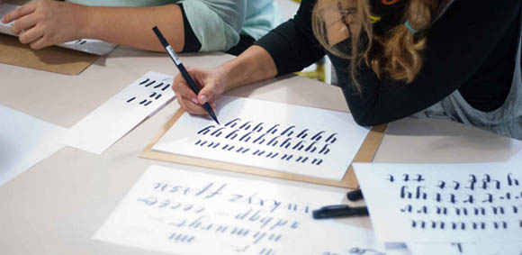 El jueves empezó fuerte con un taller de caligrafía de la mano —nunca mejor dicho— de Alberto Carnero del que aprendimos conceptos importantes como contraste, presión, proporciones, blancos, espacios, gesto y ductus armónico a través del rotulador caligráfico.