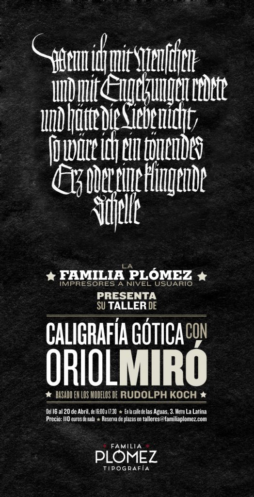 Por de pronto para celebrar esta iniciativa e inaugurar nuestro local, se nos ha ocurrido montar un taller de caligrafía gótica con el prestigioso maestro Oriol Miró. Pensamos que comenzar nuestra aventura dibujando estas venerables formas es una buena manera de convocar a todos los «heridos por la letra» a compartir su pasión con nosotros: